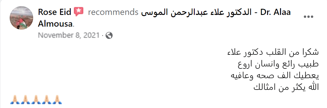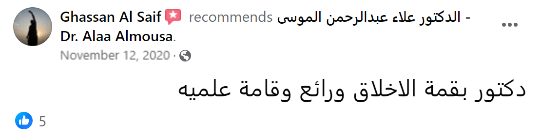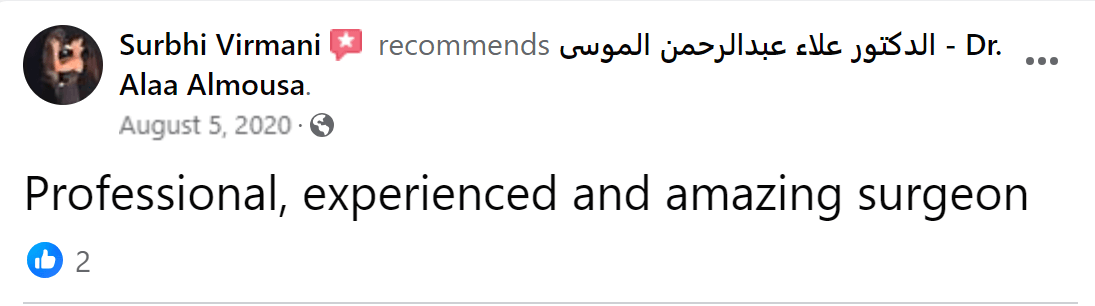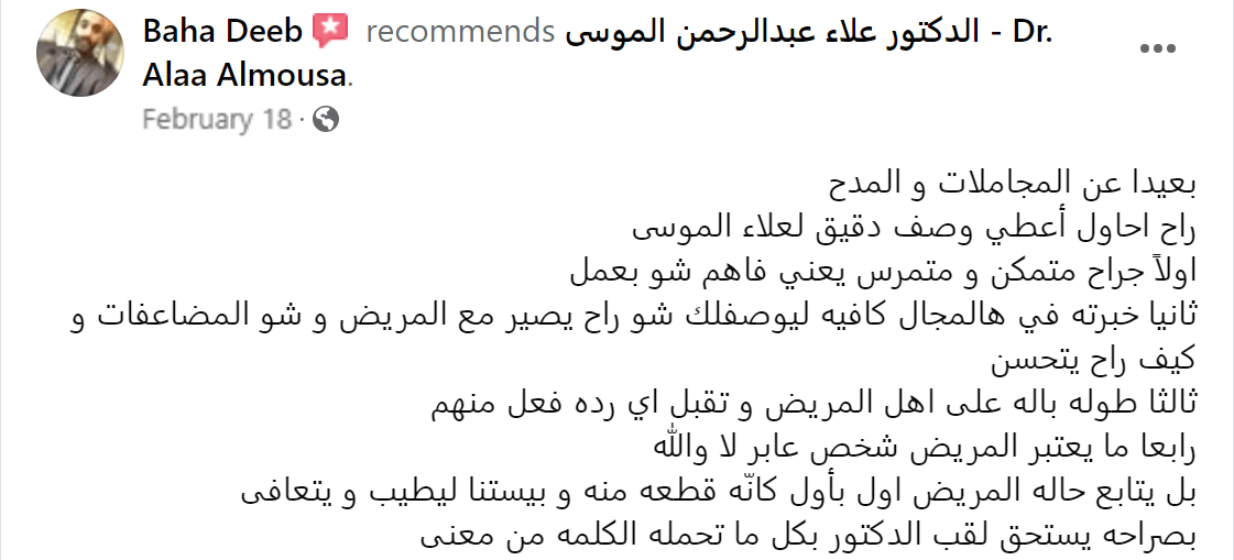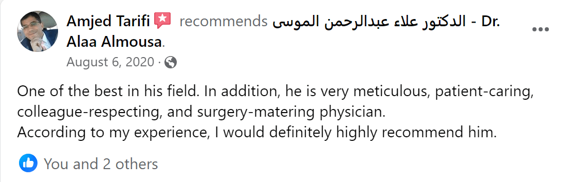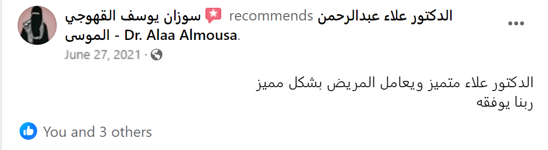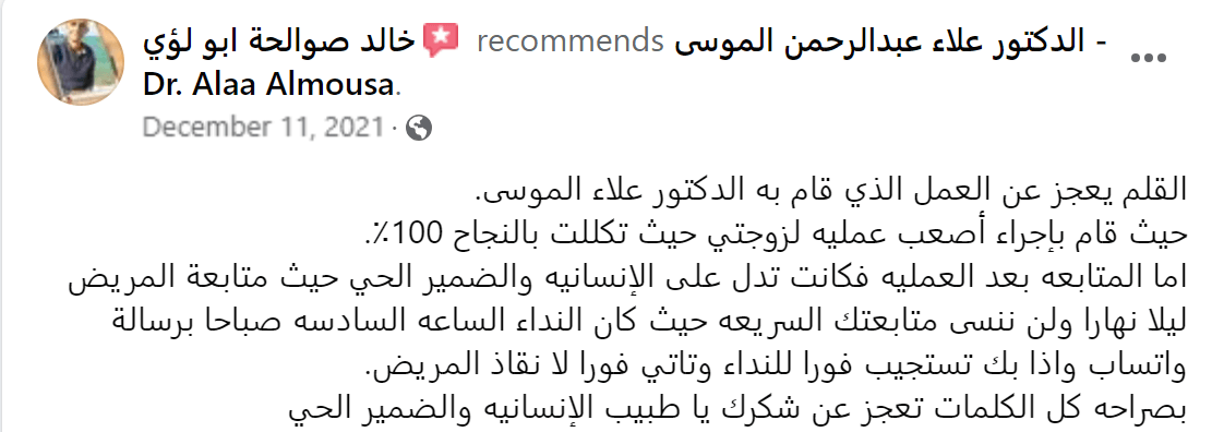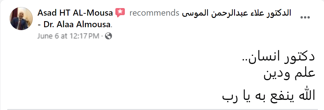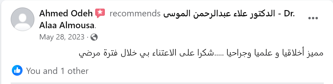 من لا يشكر الناس لا يشكر الله بفضل الله تعالى قد تم إجراء عملية جراحية على يد الدكتور علاء عبدالرحمن الموسى - Dr. Alaa Almousa Alaa Almousa صاحب الخبرة الكبيرة و الإنسانية المعطائه و من هنا ارسل له تحية اجلال و احترام و اشكر كل من تفقدني و اطمئن على صحتي من الأهل و الاصدقاء