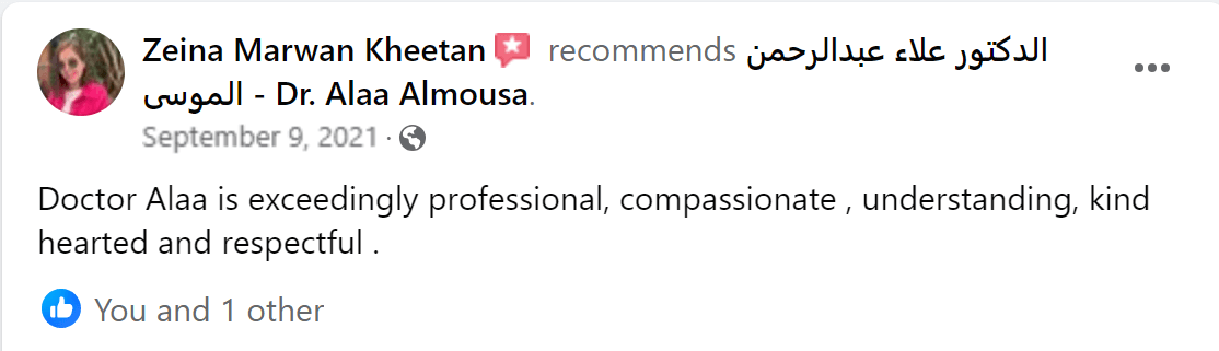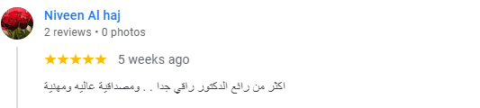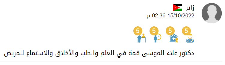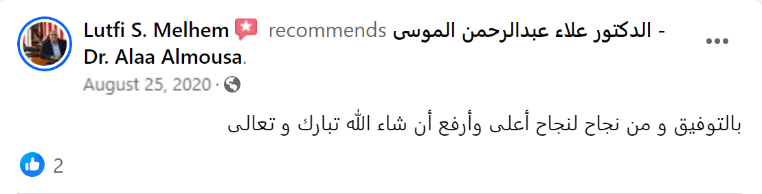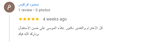 كل الشكر والامتنان للدكتور الدكتور علاء عبدالرحمن الموسى - Dr. Alaa Almousa "من لا يشكر الناس لا يشكر الله قال رسول الله صلى الله عليه وسلم: من صنع اليكم معروفاً فكافئوه فإن لم تجدوا ما تكافئونه فادعوا له حتى تروا انكم كافأتموه ...ومهما اشكر واقول عن حضرتك فلم اجد شيئا افضل من الدعاء ربنا يجازيك كل خير ويبارك ف عمرك ويجعل عملك ف ميزان حسناتك فالحمد لله على نعم الله اللهم لك الحمد علي كل النعم التي لا ثناء يوفيها