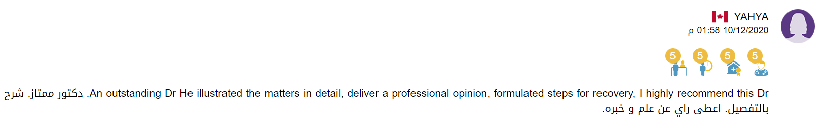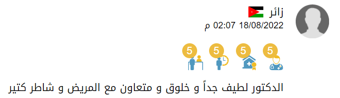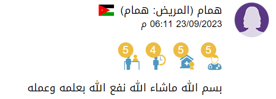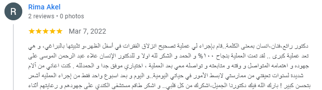 اللهم لك الحمد كما ينبغي لجلال وجهك وعظيم سلطانك .... اتقدم بخالص الشكر وجزيل العرفان من الاستشاري الدكتور علاء الموسى أخصائي جراحة الدماغ والأعصاب على إجراءة عملية لي عبارة عن تركيب الدعامات في الفقرات 4,5 وتركيب القفص الشبكي في الفقرة 3 وذلك يوم الاثنين الموافق 30/10/2023 تكللت بالنجاح كل الشكر والعرفان للاستشاري الرائع المبتسم دائما ولفريقة الطبي وجزاكم الله كل خير.